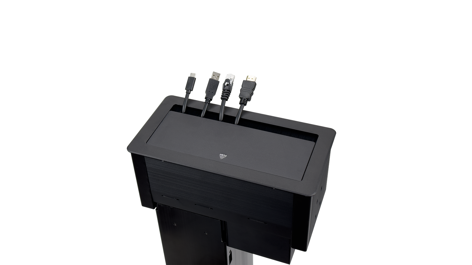 按照专业工程理念设计的产品。采用翻盖开合方式,隐藏安装,使装饰面与桌面保持齐平;有效解决多种视频设备通讯线缆简单、美观的连接。使用时抽取相应的线缆,使用后线缆会自动收回媒体接口盒。