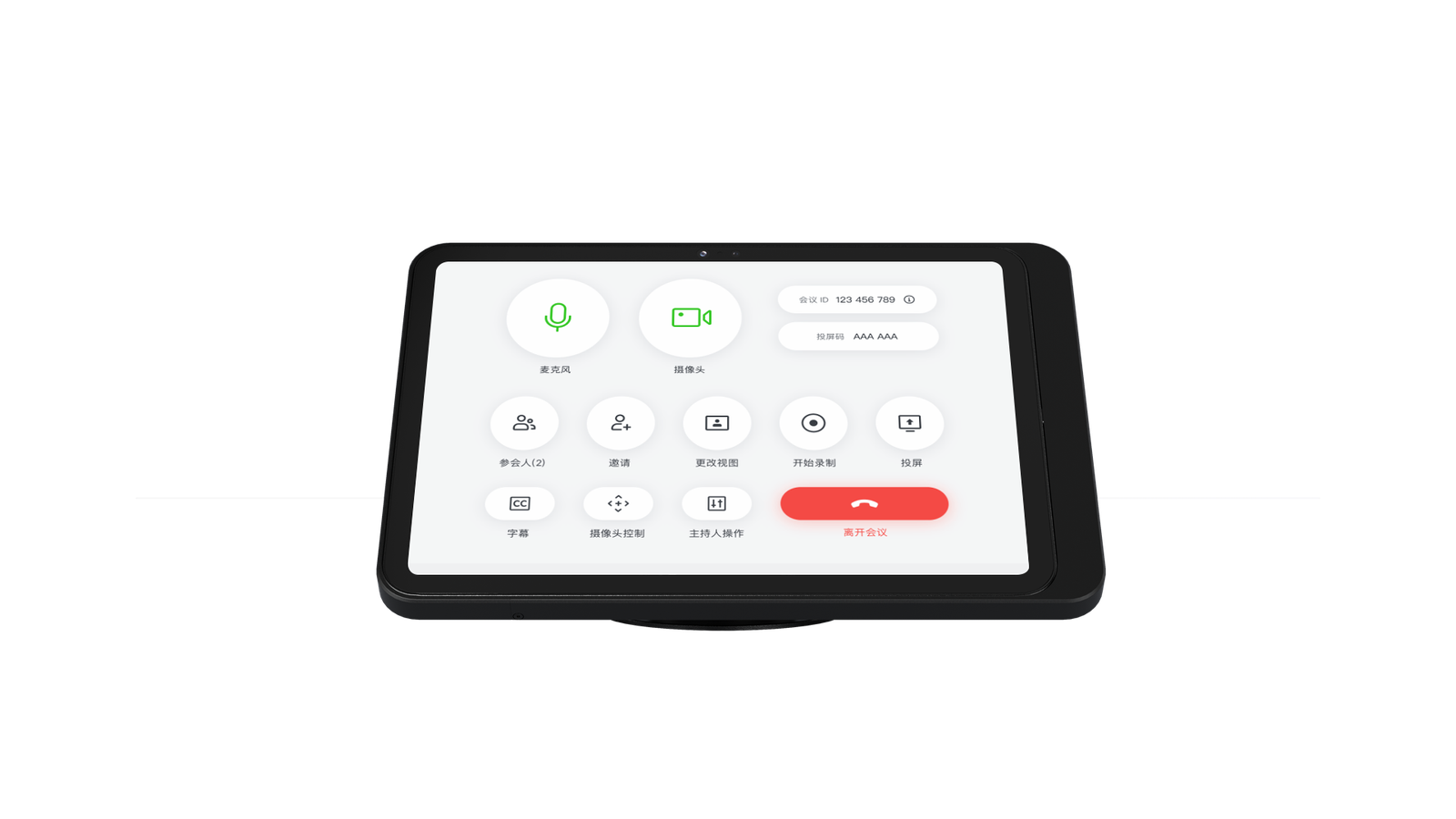 桌面旋转支架专为多人会议而设计,45°的触摸控制角度配合180°的旋转,适合在会议桌上多个位置操作。通过将PoE电源以太网适配器内置于底座中,桌面旋转支架可保持桌面整洁,同时给ipad提供安全稳定的电力及数据传输。